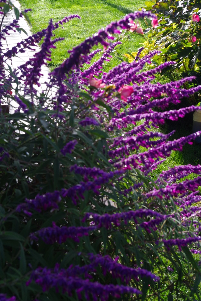湿度も下がり、ようやく秋の気配になりました。緑の芝生にメキシカンブッシュセージの紫が映えます。